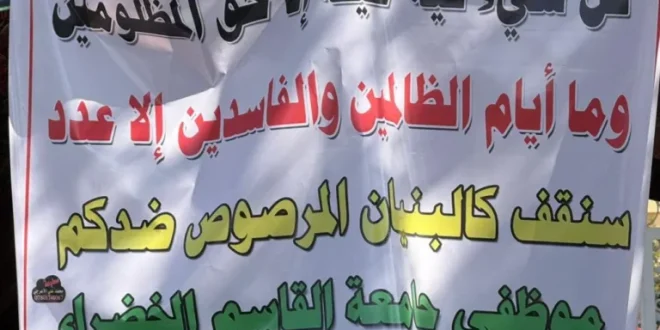 تستمر الكوادر التدريسية والإدارية في جامعة القاسم الخضراء بمحافظة بابل، يوم الثلاثاء، في اعتصامهم المفتوح لليوم الرابع على التوالي، احتجاجاً على قرار رئاسة الوزراء القاضي بإلغاء المخصصات الجامعية.