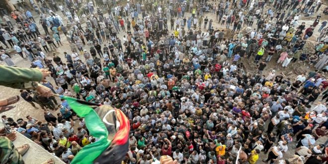 وأظهرت مقاطع فيديو تم تداولها على وسائل التواصل الاجتماعي، مجموعات كبيرة من الأشخاص، أمام مسجد الصحابة في درنة، وهم يرددون شعارات مناهضة للحكومة ويغنون: “يا وطن… سوف نبقى هنا كي يزول الألم”.