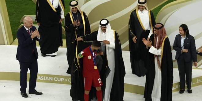 منح الشيخ تميم بن حمد آل ثاني، أمير دولة قطر، اللاعب حسن الهيدوس، “البشت” قبل تتويج منتخب بلاده بلقب كأس آسيا، على حساب منتخب الأردن.