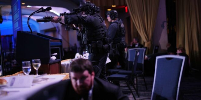 داخل الفندق، اقتحم المشتبه به نقطة تفتيش أمنية خارج قاعة الاحتفالات. وأفادت السلطات أن عميل الخدمة السرية الذي أصيب في الهجوم تلقى العلاج وغادر المستشفى.