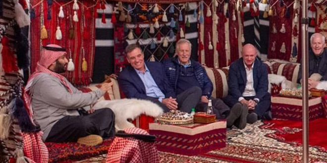 تداول نشطاء على مواقع التواصل الاجتماعي صورة لولي العهد السعودي، الأمير محمد بن سلمان خلال استقباله عددا من المشرعين الأمريكيين في خيمة في منطقة العُلا الأمر الذي أثار تفاعلا.