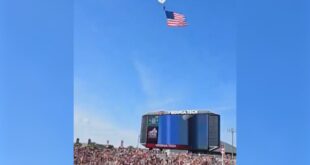 بعد هبوطهم بالمظلات في ملعب لين التابع لجامعة فرجينيا للتقنية استعدادًا لمباراة الربيع لعام 2026، اصطدم أحد المظليين الثلاثة بلوحة شاشة العرض الضخمة، وعلق عليها بينما دفعت الرياح مظليًا آخر…